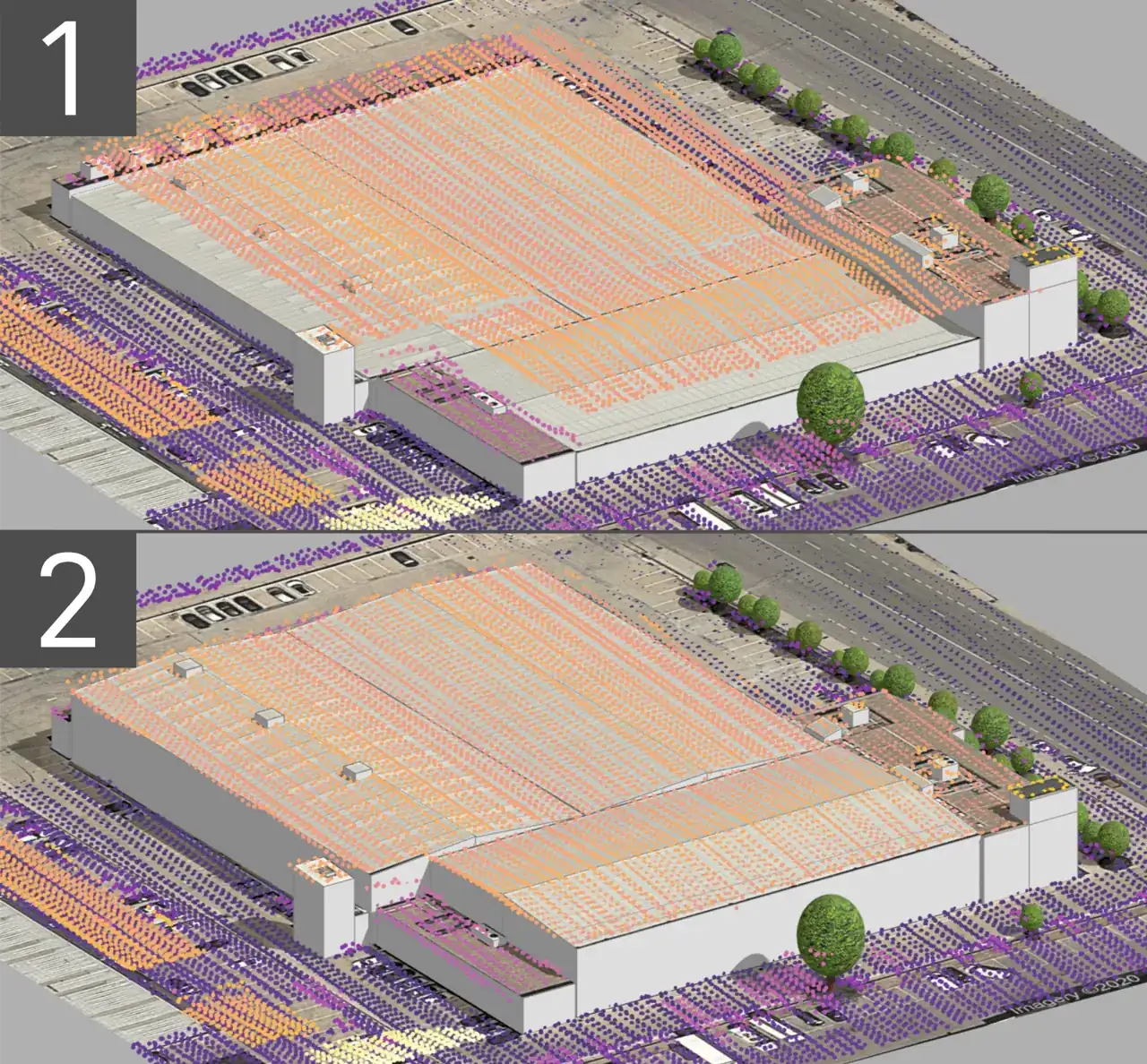 Dies richtet die Punktwolke automatisch am Luftbild aus und passt die Höhe, Neigung und Ausrichtung der Dächer an: