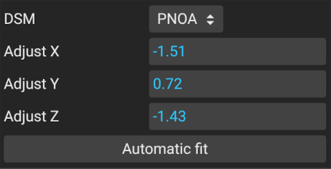 Da die DOM-Punktwolke und das Luftbild aus unterschiedlichen Quellen stammen, kann es zu Verschiebungen kommen. Um sie auszurichten, verwenden Sie die Regler für X, Y und Z (X und Y für die horizontale Ausrichtung mit dem Luftbild und Z für die vertikale Ausrichtung mit der Bodenreferenz):