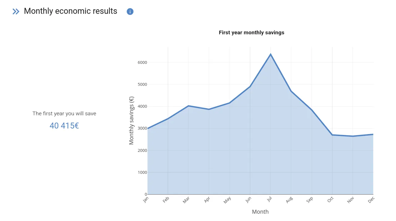 One of the most important sections of the proposal for your client is the one that details the results of savings and profitability, both monthly (first year) and total (throughout the simulation period).